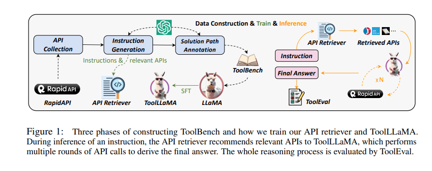 The team starts by collecting a high-quality instruction-tuning dataset ToolBench, the construction procedure entails three phases: 1) API Collection, the team collected 16464 REST APIs from RapidAPI spanning 49 categories such as social media, e-commerce, and weather. 2) Instruction Generation: they sampled APIs from the whole collected set and prompt ChatGPT to generate diverse instructions for both single-tool and multi-tool scenarios. 3) Solution Path Annotation: they annotated high-quality responses to these instructions. And to make data collection inefficient, they introduce a novel depth-first search-based decision tree (DFSDT) to boost the planning and reasoning ability of LLMs.