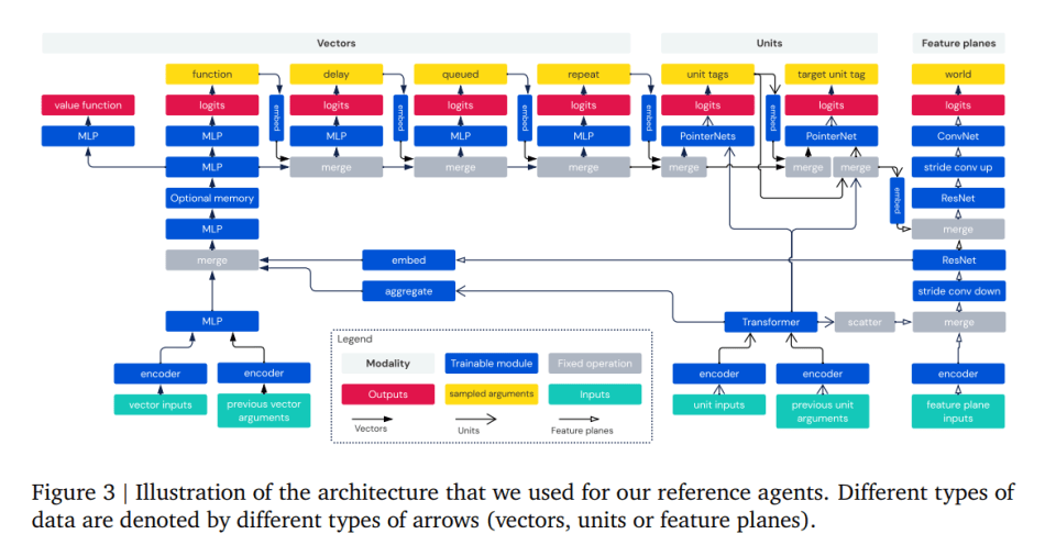 The team also provides 6 reference agents to be used as baselines and for evaluation metrics. In the agent architecture, inputs of the raw StarCraft II API consist of three modalities: vectors, units and feature planes; actions consist of seven modalities: function, delay, queued, repeat, Unit_tags, target_unit_tag and world action.