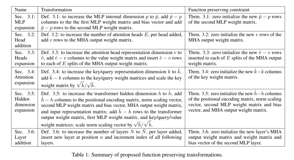 The team summarizes their main contributions are six composable function preserving transformations for Transformer-based architecture: 1) size of MLP internal representation, 2) number of attention heads, 3) size of the attention heads output representation, 4) size of the attention input representation, 5) size of the transformer layers input/output representations, 6) number of layers.