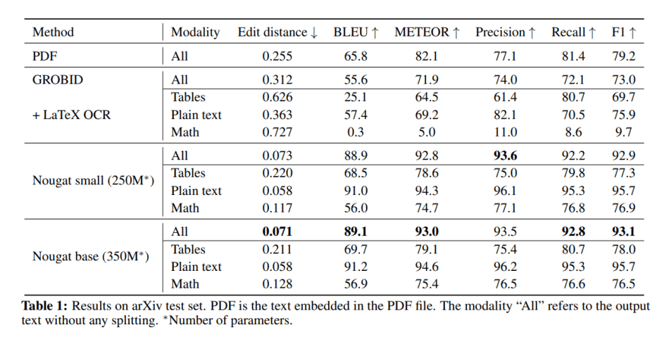 In their empirical study, the team compared Nougat with baseline model GROBID, Nougat achieves the highest performance in all metrics, including Edit distance, BLEU, METEOR and F-measure.