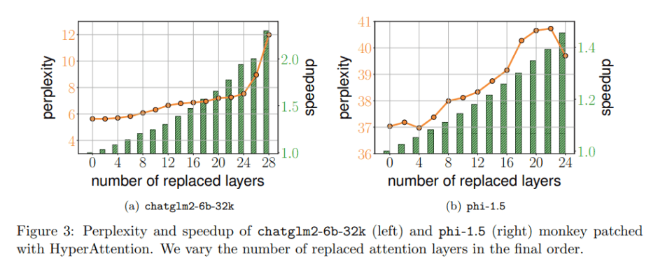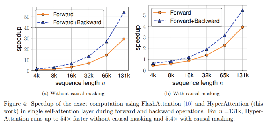 In empirical testing, HyperAttention outperforms existing methods, demonstrating substantial speed improvements compared to state-of-the-art solutions such as FlashAttention. For instance, HyperAttention accelerates the inference time of ChatGLM2 by 50% when handling a context length of 32,000 tokens, with only a slight increase in perplexity from 5.6 to 6.3. In scenarios involving larger context lengths, e.g., 131,000 tokens with causal masking, HyperAttention offers a remarkable 5-fold speedup on a single attention layer.