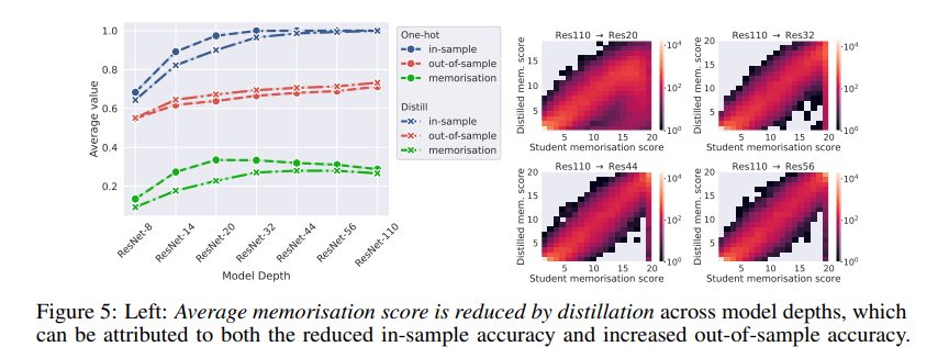 The researchers wrap up their study with a quantitative analysis demonstrating that distillation, a process used to transfer knowledge from a large teacher model to a smaller student model, tends to inhibit memorization. This inhibition is particularly evident for samples that the one-hot, non-distilled student model memorizes. Intriguingly, they observe that distillation primarily suppresses memorization in examples where memorization increases as model size grows. This observation leads to the conclusion that distillation enhances generalization by constraining the memorization of challenging examples.