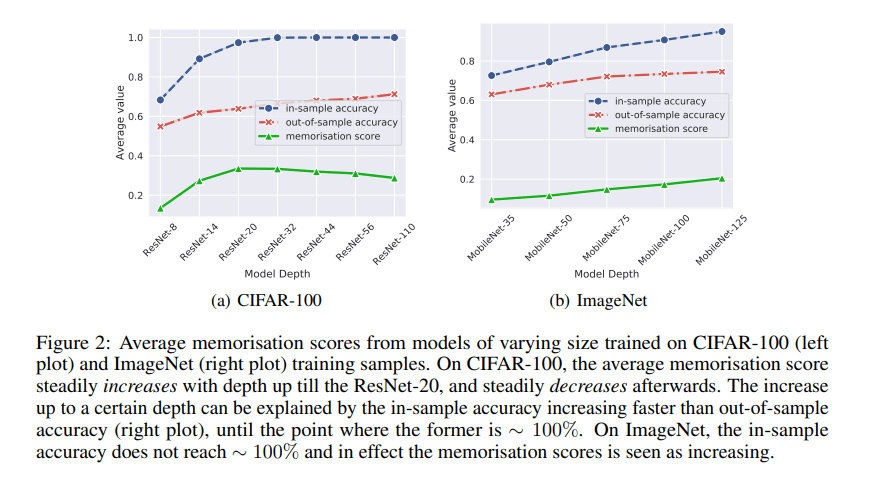The research team initiates their study with a quantitative examination of how memorization varies in relation to model complexity, specifically the depth and width of a ResNet used for image classification. They visually illustrate how the depth of a ResNet influences the memorization score on two prominent datasets, CIFAR-100 and ImageNet. Surprisingly, their analysis uncovers that the memorization score escalates up to a depth of 20, but then, in contrast to initial assumptions, begins to decrease.