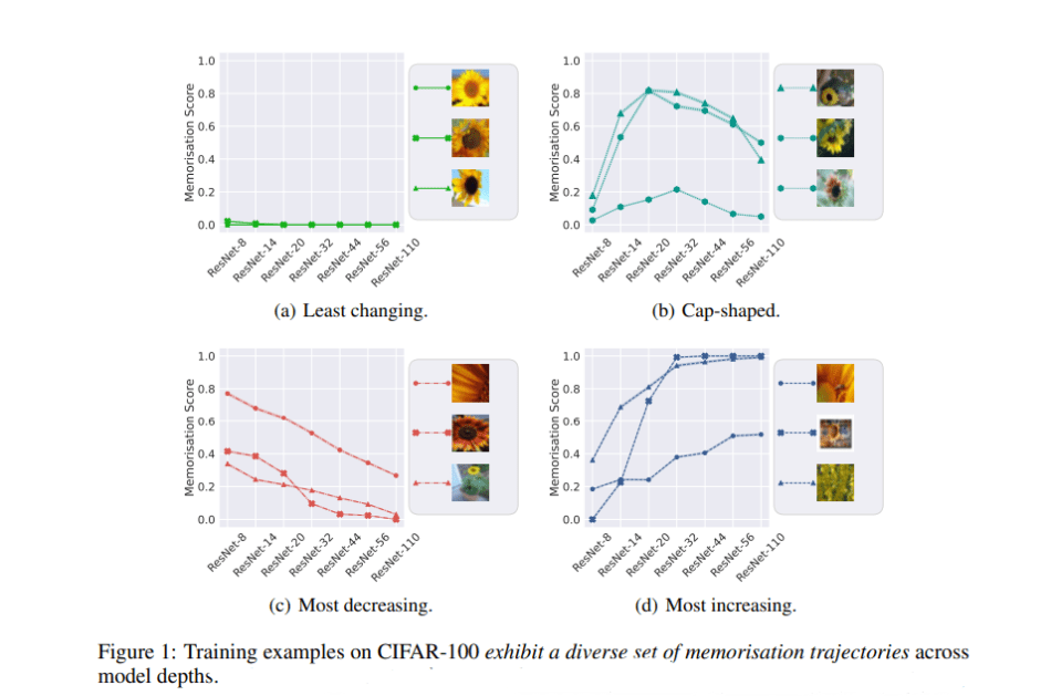 To further delve into the bi-modal memorization pattern, the research team presents instances that exhibit varying memorization score trajectories across different model sizes. They identify four prominent types of trajectories, including those in which memorization increases with model complexity. Notably, they find that particularly ambiguous and mislabeled examples follow this kind of trajectory.