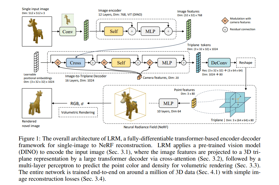 The LRM approach adopts a robust transformer-based encoder-decoder architecture for acquiring 3D object representations from a single image in a data-driven fashion. The model takes an image as input and regresses a Neural Radiance Field (NeRF) in the form of a triplane representation. To achieve this, LRM employs the pre-trained visual transformer DINO (Caron et al., 2021) as the image encoder to generate image features. Subsequently, it learns an image-to-triplane transformer decoder to project the 2D image features onto the 3D triplane through cross-attention, effectively modeling relationships among the spatially-structured triplane tokens via self-attention.