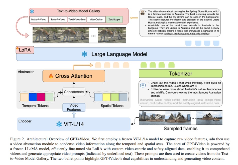 The team initiates the process by utilizing a frozen ViT-L/14 model to capture raw video features, followed by employing a video abstraction module to condense video information across temporal and spatial axes. GPT4Video’s core is driven by a frozen LLaMA model, efficiently fine-tuned via LoRA with custom video-centric and safety-aligned data. This equips it to comprehend videos and generate appropriate video prompts, subsequently used to produce videos from the Textto-Video Model Gallery.