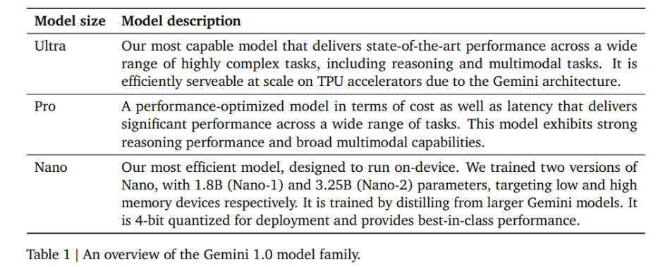 The foundation of Gemini models lies in Transformer decoders (Vaswani et al., 2017), augmented with enhancements in architecture and model optimization. These improvements facilitate stable training at scale and optimized inference on Google’s Tensor Processing Units. The inaugural version, Gemini 1.0, is available in three sizes: Ultra, designed for highly complex tasks; Pro, offering enhanced performance and deployability at scale; and Nano, tailored for on-device applications, each addressing distinct computational limitations and application requirements.