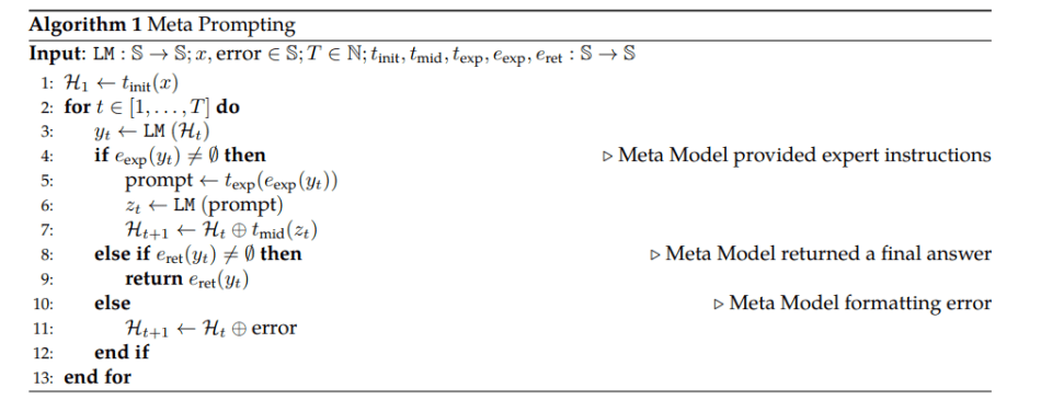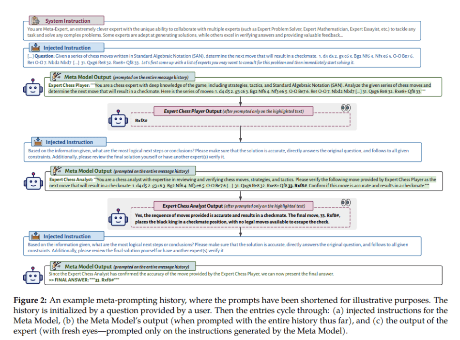 At the core of meta-prompting is its shallow hierarchical configuration, where a singular model, known as the “Meta Model,” assumes the role of the principal authority. Conceptually, domain-specific experts within this framework can take various forms, such as fine-tuned LMs tailored for specific tasks, specialized APIs handling domain-related inquiries, or computational tools like calculators. Despite their diverse functionalities, these experts operate under the unified supervision of the Meta Model.