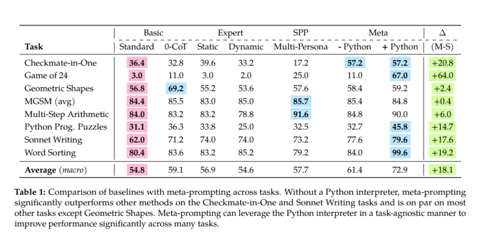 In a new paper Meta-Prompting: Enhancing Language Models with Task-Agnostic Scaffolding, the team introduces meta-prompting. This innovative scaffolding approach proves to be highly effective, surpassing standard prompting by 17.1%, expert (dynamic) prompting by 17.3%, and multi-persona prompting by 15.2%.
