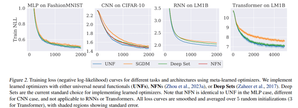 In their empirical evaluation, the researchers contrasted the performance of UNFs against prior methods across two categories of weight-space tasks: predicting the generalization of recurrent sequence-to-sequence models and training learned optimizers for diverse architectures and datasets. The results unequivocally demonstrate the efficacy of UNFs in tasks involving the manipulation of weights and gradients in various domains, including convolutional image classifiers, recurrent sequence-to-sequence models, and Transformer language models. Particularly noteworthy are the promising enhancements observed over existing learned optimizer designs in small-scale experiments.