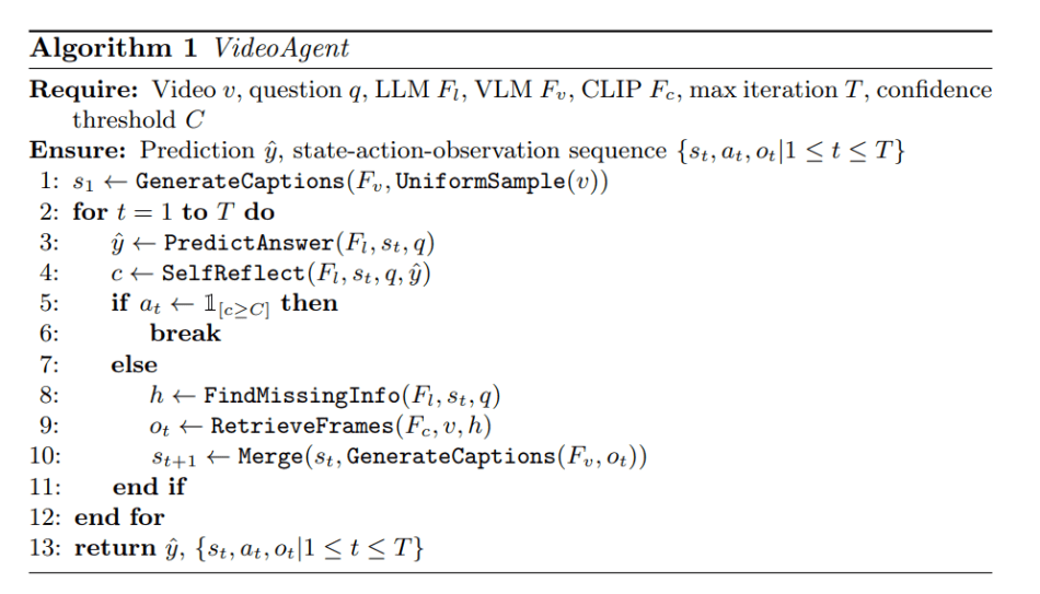 The process is formulated as a sequence of states, actions, and observations, with the LLM orchestrating this progression. Initially, the LLM acquaints itself with the video context by reviewing a set of uniformly sampled frames. During each iteration, it evaluates whether the existing information is adequate to answer the question; if not, it determines what additional information is necessary. It then utilizes Contrastive Language-Image Pre-training (CLIP) to retrieve new frames containing this information and Vision-Language Models (VLM) to caption these frames, updating the current state.