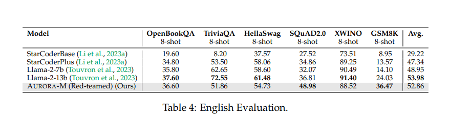 Rigorous evaluations confirm AURORA-M’s efficacy in avoiding catastrophic forgetting in English and coding tasks while showcasing competitive multilingual performance. Overall, AURORA-M not only excels in multilingual understanding and coding tasks but also underscores the collaborative ethos of the open-source community, promoting transparency and accessibility in AI development.