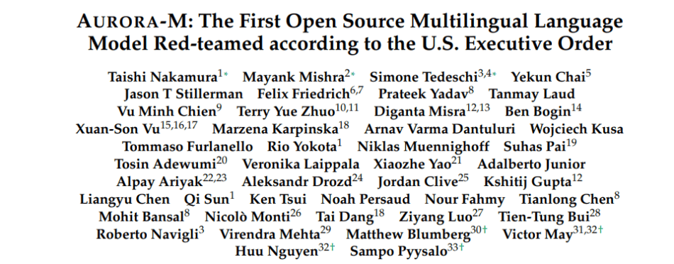 In a new paper Aurora-M: The First Open Source Multilingual Language Model Red-teamed according to the U.S. Executive Order, a collaborative effort involving researchers from 33 institutions presents AURORA-M, the inaugural open-source multilingual language model fine-tuned in accordance with the U.S. Executive Order. AURORA-M, a 15-billion-parameter model, is trained on English, Finnish, Hindi, Japanese, Vietnamese, and code, specifically tailored to mitigate the aforementioned limitations.