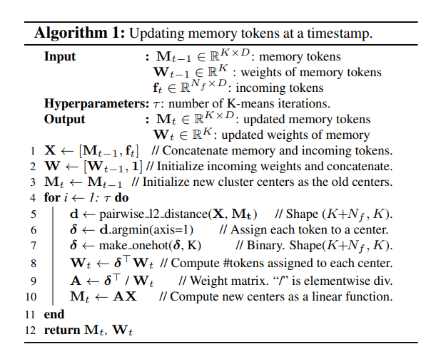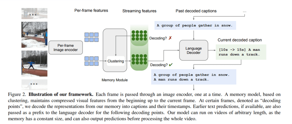 The key components of this novel model include a new memory module and a streaming decoding algorithm. The memory module employs a unique approach based on clustering incoming tokens, allowing it to handle videos of varying lengths within a fixed memory capacity. Utilizing K-means clustering, the model represents the video at each timestamp using a fixed number of cluster-center tokens, ensuring simplicity and efficiency while accommodating varying frame counts within a predetermined computational budget during decoding.