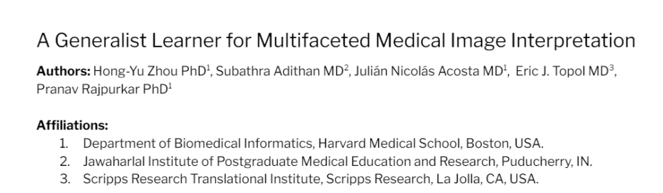 The paper A Generalist Learner for Multifaceted Medical Image Interpretation is on arXiv.