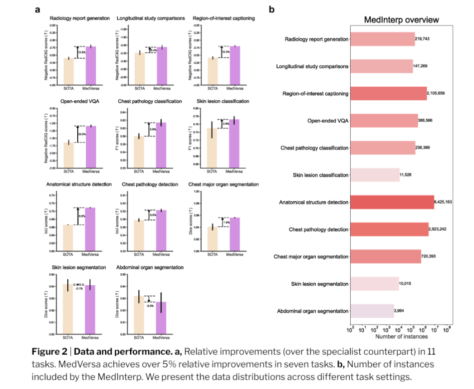 To support the development of MedVersa, the researchers curated a diverse, multimodal dataset called MedInterp, specifically designed for multifaceted medical image interpretation. Training and assessing MedVersa on the MedInterp dataset demonstrated that it surpasses state-of-the-art specialist counterparts in nine tasks.